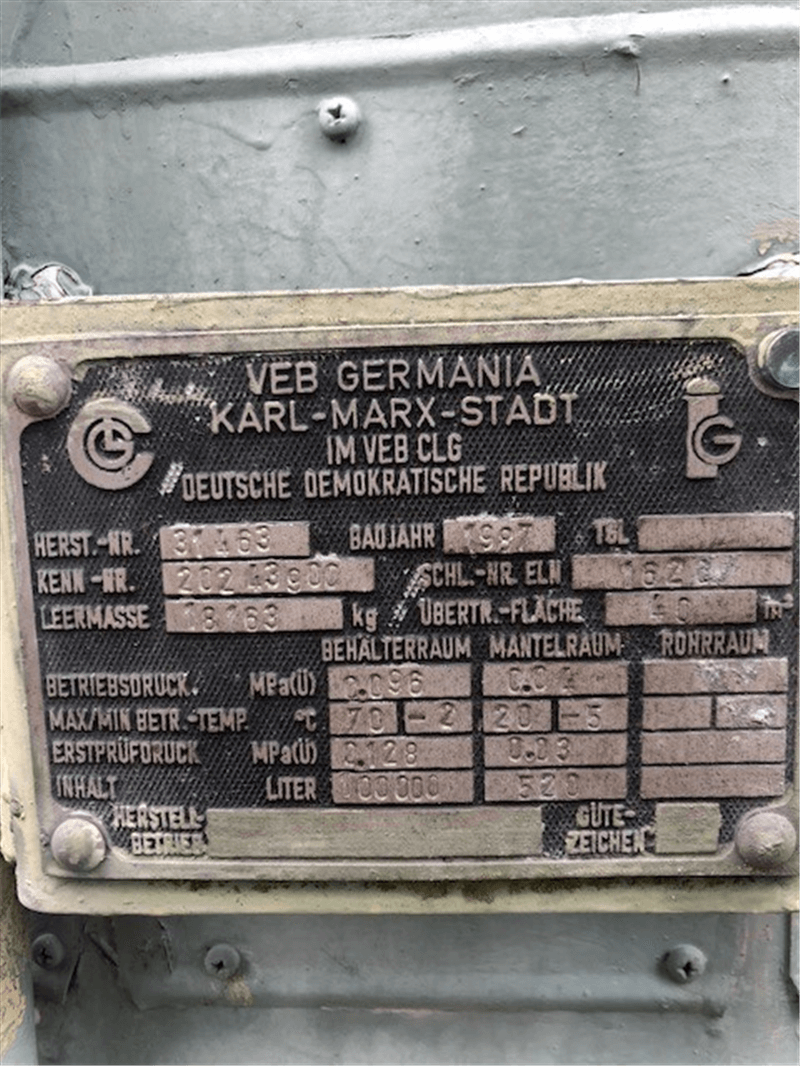 Description (EN) | Tank is on a steel foot ring 1 flange connection NW 500 with lowered CIP line DN 80 1 vent pipe DN 200 on the body Flange connection NW 50 for heating system in and out. On the bottom: 1 manhole 450 x 350 mm Outlet DN 100 |