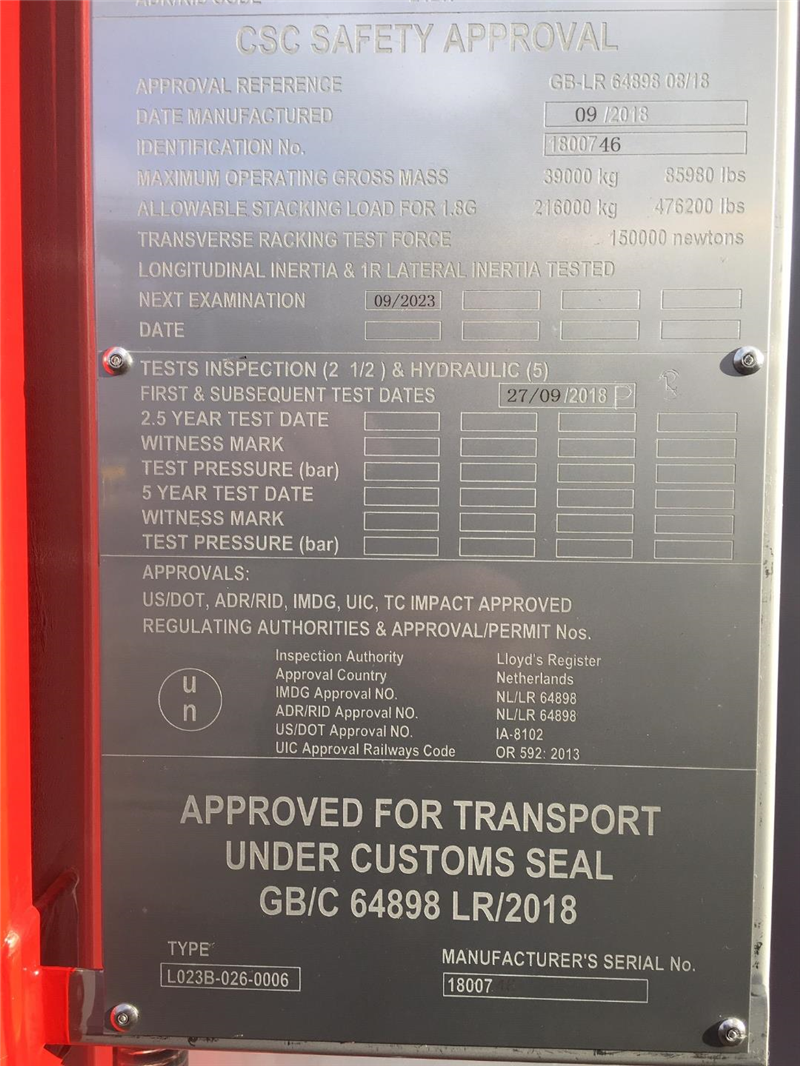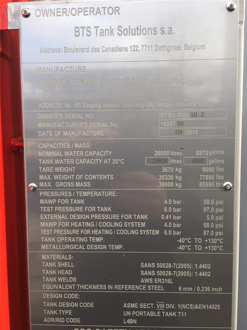 | Design Code | ASME VIII Div1 & EN14025, where applicable ADR/RID L4BN, UIC, TIR, CSC, ISO1496-3 |