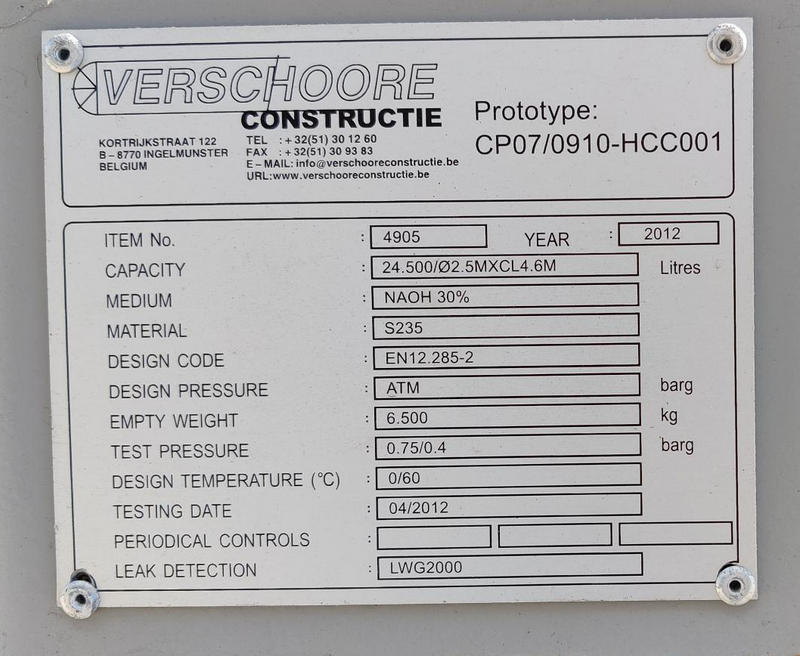 Description (EN) | working pressure ATM --- test pressure 0.75/0.4 barg --- design temperature 0°C-60°C --- incl. switch cabinet --- no leak detection system available |
